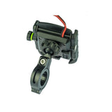Attach the mount to a *ROUND handlebar with a diameter of 22 to 32mm, connect the mount to your battery, red to positive (+), black to negative (-) and you have power. The mount has a 5V/2.5A USB charge port, an ON/OFF switch and comes with a free USB cable suitable for charging Apple and SOME Samsung phones.